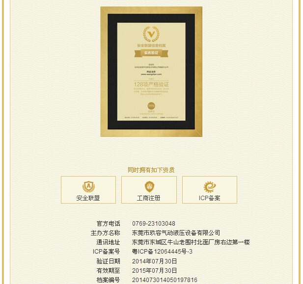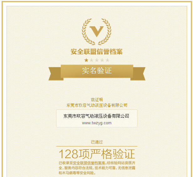 恭喜東莞市玖容氣動液壓設(shè)備有限公司獲得了安全聯(lián)盟認(rèn)證!我們通過了128項史上最嚴(yán)格的安全檢測,并非常榮幸地載入安全聯(lián)盟信譽(yù)檔案庫。我們將信守承諾,與安全聯(lián)盟200萬站長共同努力,為大家提供安全可靠的產(chǎn)品和服務(wù)。玖容增壓缸感謝您的支持!認(rèn)證詳情請查看榮譽(yù)證書http://t.cn/RPICS5j